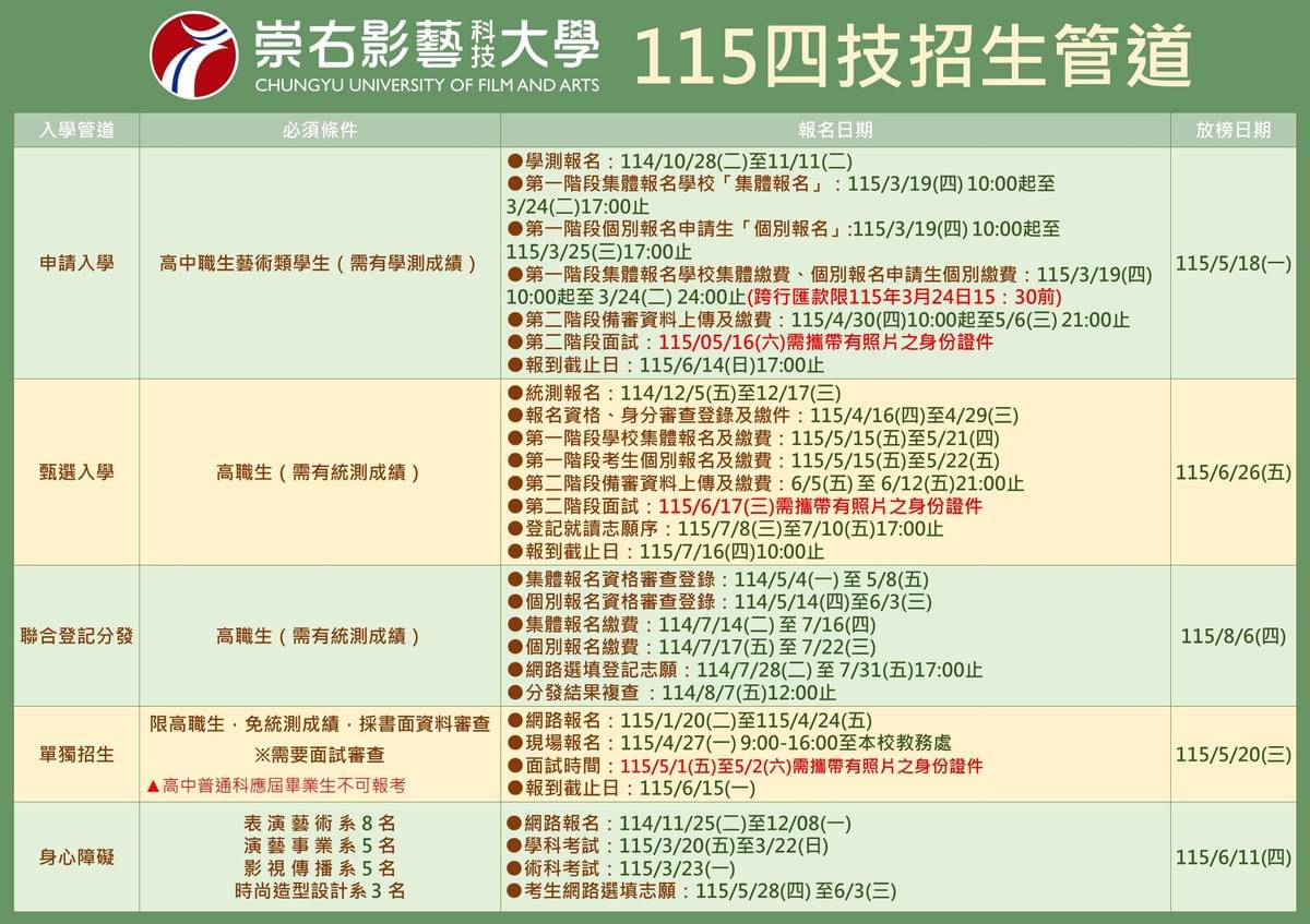 參與崇右影藝科技大學 單獨招生或申請入學方式就讀